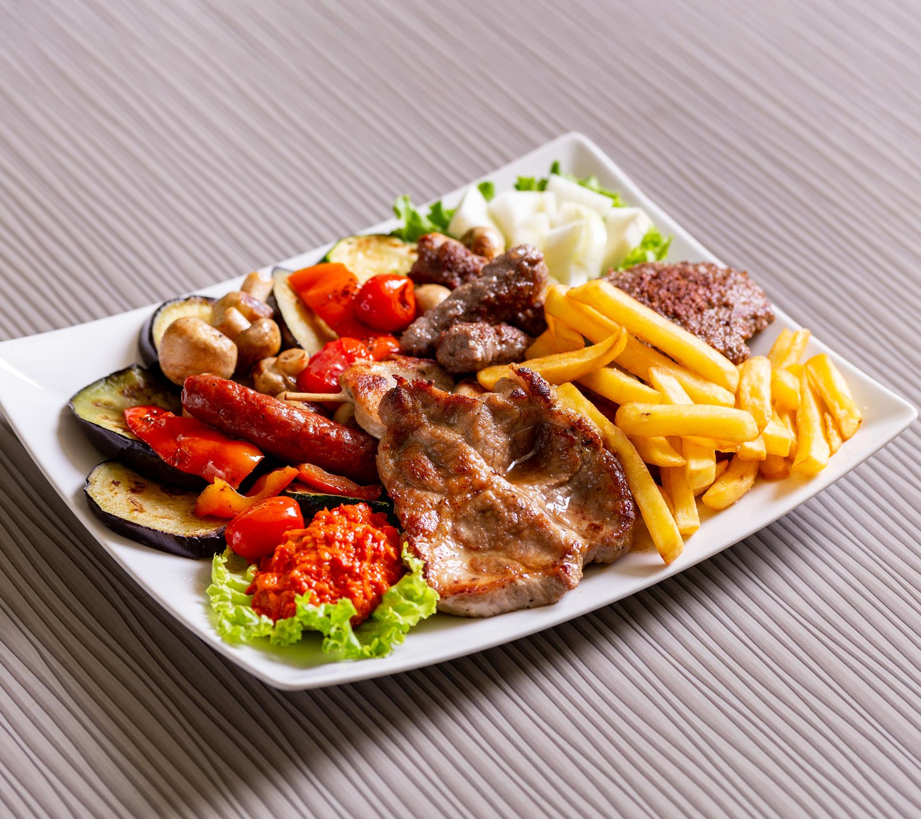 Specialità: piatti alla griglia come cevapcici (tipiche salsicce senza cotenna) o pljeskavice (tipici hamburger speziati), gamberi fritti o alla griglia, pesce azzurro fritto o alla griglia.