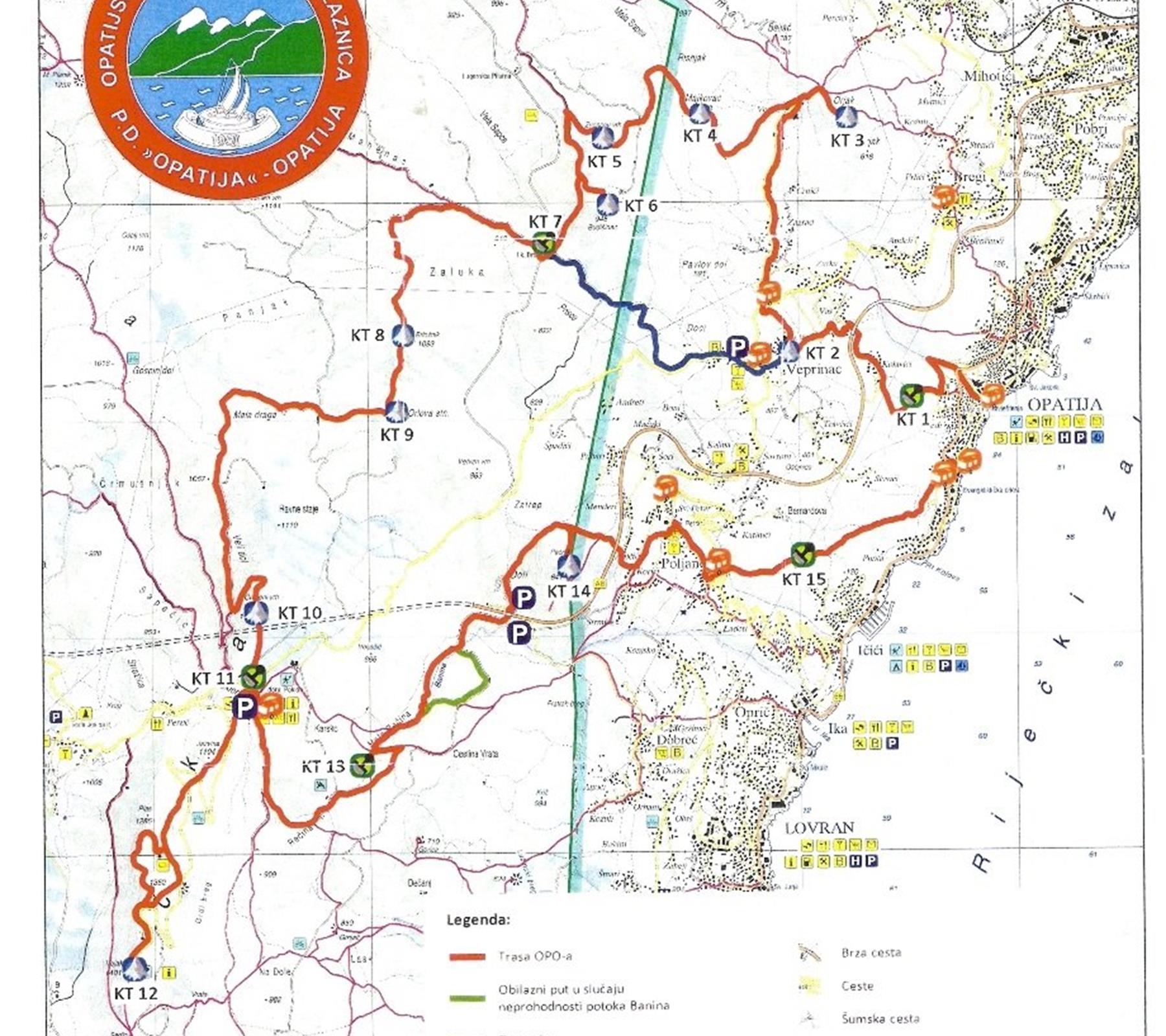 OPO je duga 45 km, uključuje 15:30 sati hoda, a može se proći za dva dana hoda, s mogućnošću noćenja u Planinarskom domu „Poklon“, koji je planinarima otvoren vikendom i praznicima. Vrijeme prolaska nije ograničeno. Planinari koji vrše obilazak u etapama mogu se približiti pojedinim KT-ima koristeći se autobusnim vezama prema Veprincu, Poljanama i Poklonu.