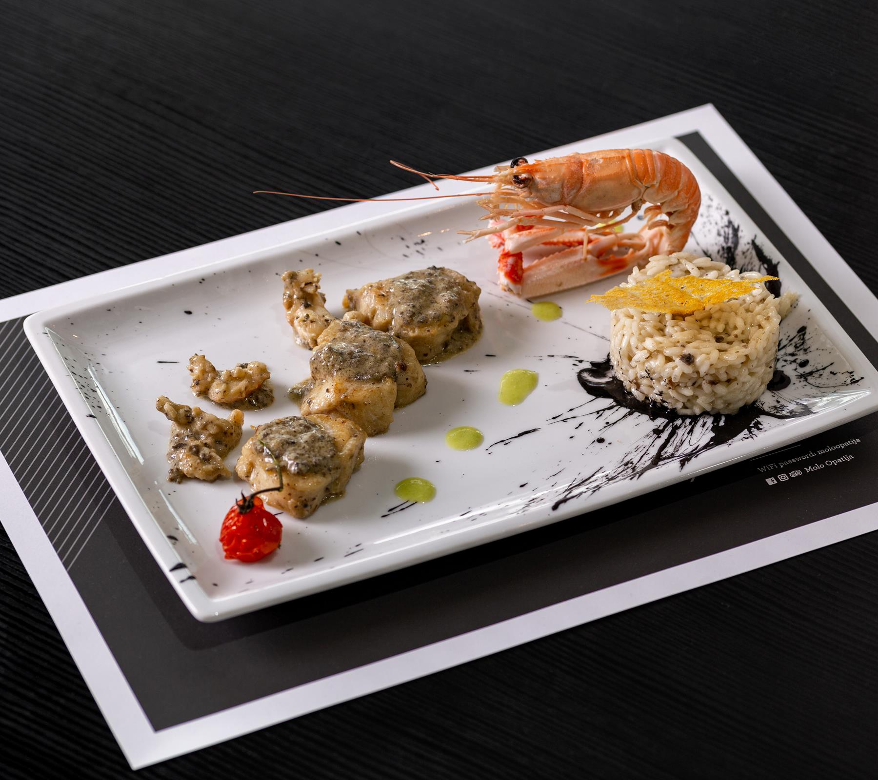 Specijaliteti: Tatarski biftek od tune, špageti s vongolama i škampima, ravioli punjeni skutom na kremi od buče, crni njoki s kozicama, tikvicama i fermentiranim cherry rajčicama.